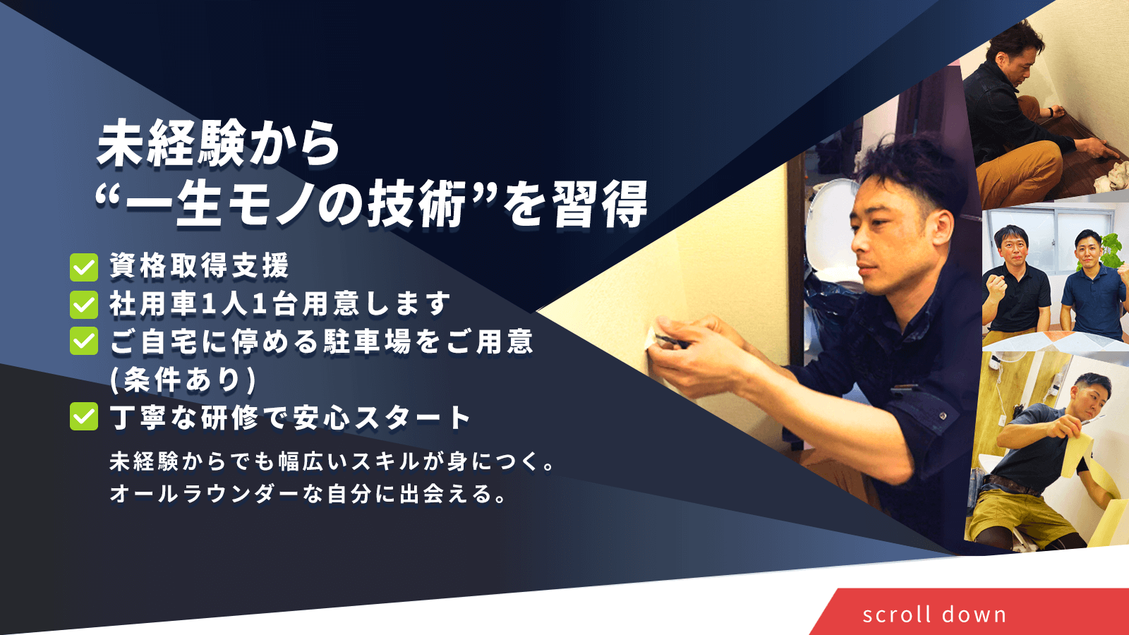 | 募集背景 | 数あるリフォーム会社の中でも、当社は特に『水回りのスペシャリスト』として、約20年にわたり水回り専門の施工に携わってきました。 これまでの実績が評価され、多くのお客様からの紹介やホームページ経由のお問い合わせが急増しています。より多くのお客様にご満足いただくため、スタッフを強化したいと考え、このたび新たな仲間を募集することになりました。 近年は新築物件の価格が高騰している影響で、リノベーションを前提に中古物件を購入される方や、ご家族の高齢化に伴い自宅のリフォームを希望される方が増えており、業界全体も非常に活気づいています。  |